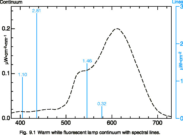 Discharge sources emit large amounts of irradiance at particular atomic spectral lines, in addition to a constant, thermal based continuum. The most accurate way to portray both of these aspects on the same graph is with a dual axis plot, shown in figure 9.1. The spectral lines are graphed on an irradiance axis (W/cm2) and the continuum is graphed on a band irradiance (W/cm2/nm) axis. The spectral lines ride on top of the continuum.