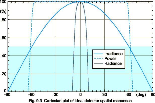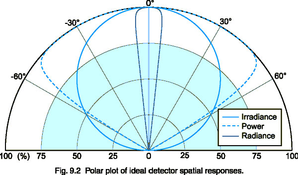 The best way to represent the responsivity of a detector with respect to incident angle of light is by graphing it in Polar Coordinates. The polar plot in figure 9.2 shows three curves: A power response (such as a laser beam under filling a detector), a cosine response (irradiance overfilling a detector), and a high gain response (the effect of using a telescopic lens). This method of graphing is desirable, because it is easy to understand visually. Angles are portrayed as angles, and responsivity is portrayed radially in linear graduations.