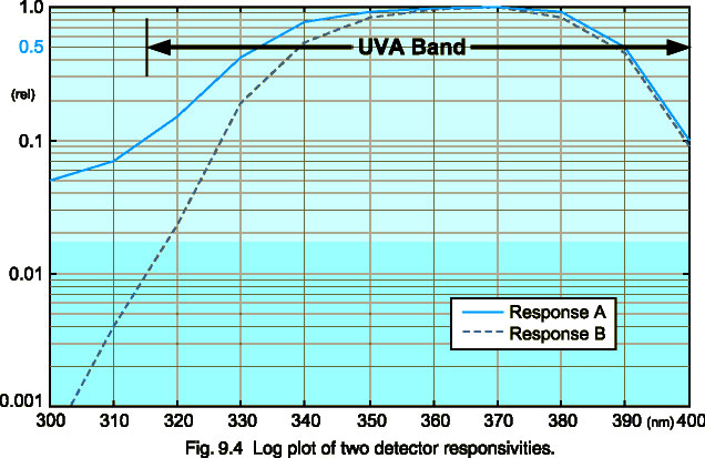 As you can clearly see in figure 9.4, response B is within 10 percent of response A between 350 and 400 nm. Below 350 nm, however, they clearly mismatch. In fact, at 315 nm, response B is 10 times higher than response A. This mismatch is not evident in the linear plot, figure 9.5, which is plotted with the same data.