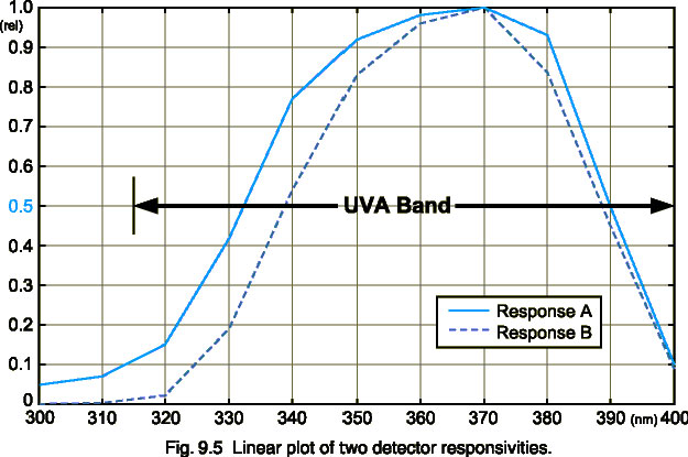 Most people are familiar with graphs that utilize linearly scaled axes. This type of graph is excellent at showing bandwidth, which is usually judged at the 50 percent power points. In figure 9.5, it is easy to see that response A has a bandwidth of about 58 nm (332 to 390 nm). It is readily apparent from this graph that neither response A nor response B would adequately cover the entire UVA band (315 to 400 nm), based on the location of the 50 percent power points. In the log plot of the same data (fig. 9.4), both curves appear to fit nicely within the UVA band.