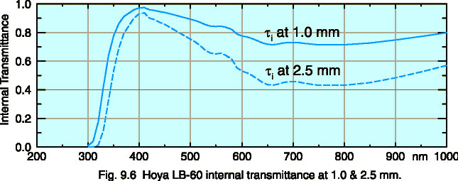 Linear transmission curves are only useful for a single thickness (fig. 9.6). Diabatie curves retain the same shape for every filter glass thickness, permitting the use of a transparent sliding scale axis overlay, usually provided by the glass manufacturer. You merely line up the key on the desired thickness and the transmission curve is valid.
