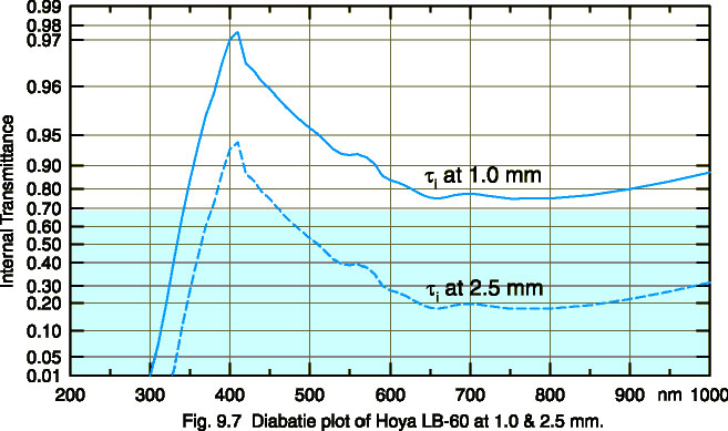 The Diabatie scale (see fig. 9.7) is a log-log scale used by filter glass manufacturers to show internal transmission for any thickness.