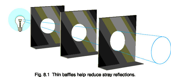 Baffles, for example, greatly reduce the influence of stray light reflections. A baffle is simply a sharp edged hole in a piece of thin sheet metal that has been painted black. Light outside of the optical beam is blocked and absorbed without affecting the optical path.