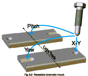 To make a kinematic fixture, cut a cone and a conical slot into a piece of metal using a 45° conical end mill (see fig. 8.2). A kinematic mount is a three point fixture, with the third point being any planar face. The three mounting points can be large bolts that have been machined into a ball on one end, or commercially available 1/4-80 screws with ball bearing tips (from Thorlabs, Inc.) for small fixtures.