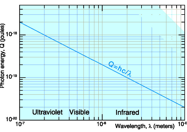 where Q is the photon energy (joules), h is Planck's constant (6.623 x 10-34 J s), c is the speed of light (2.998 x 108 m s-1), and l is the wavelength of radiation (meters). All light measurement units are spectral, spatial, or temporal distributions of optical energy. As you can see in figure 2.1, short wavelength ultraviolet light has much more energy per photon than either visible or long wavelength infrared.
