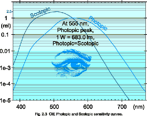 The lumen (lm) is the photometric equivalent of the watt, weighted to match the eye response of the "standard observer". Yellowish-green light receives the greatest weight because it stimulates the eye more than blue or red light of equal radiometric power:
